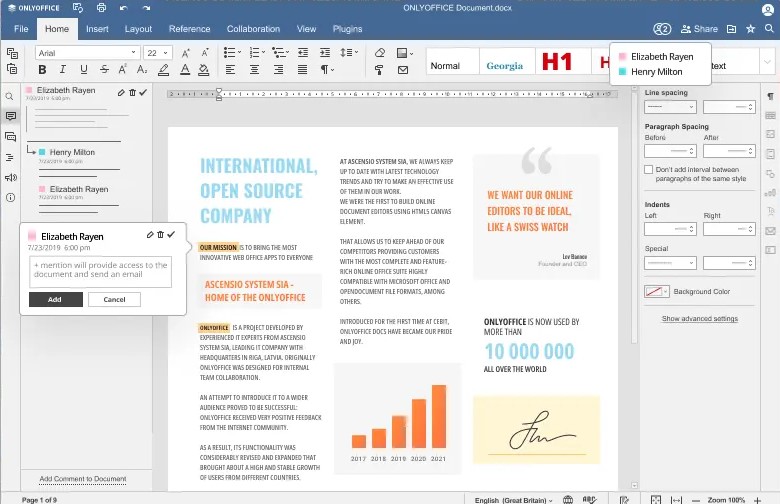 OnlyOffice membawa kolaborasi ke tingkat berikutnya dengan menggabungkan pengeditan dokumen, manajemen proyek, dan CRM dalam satu platform. Ini ideal bagi bisnis yang mencari solusi menyeluruh untuk menyederhanakan proses kerja mereka.